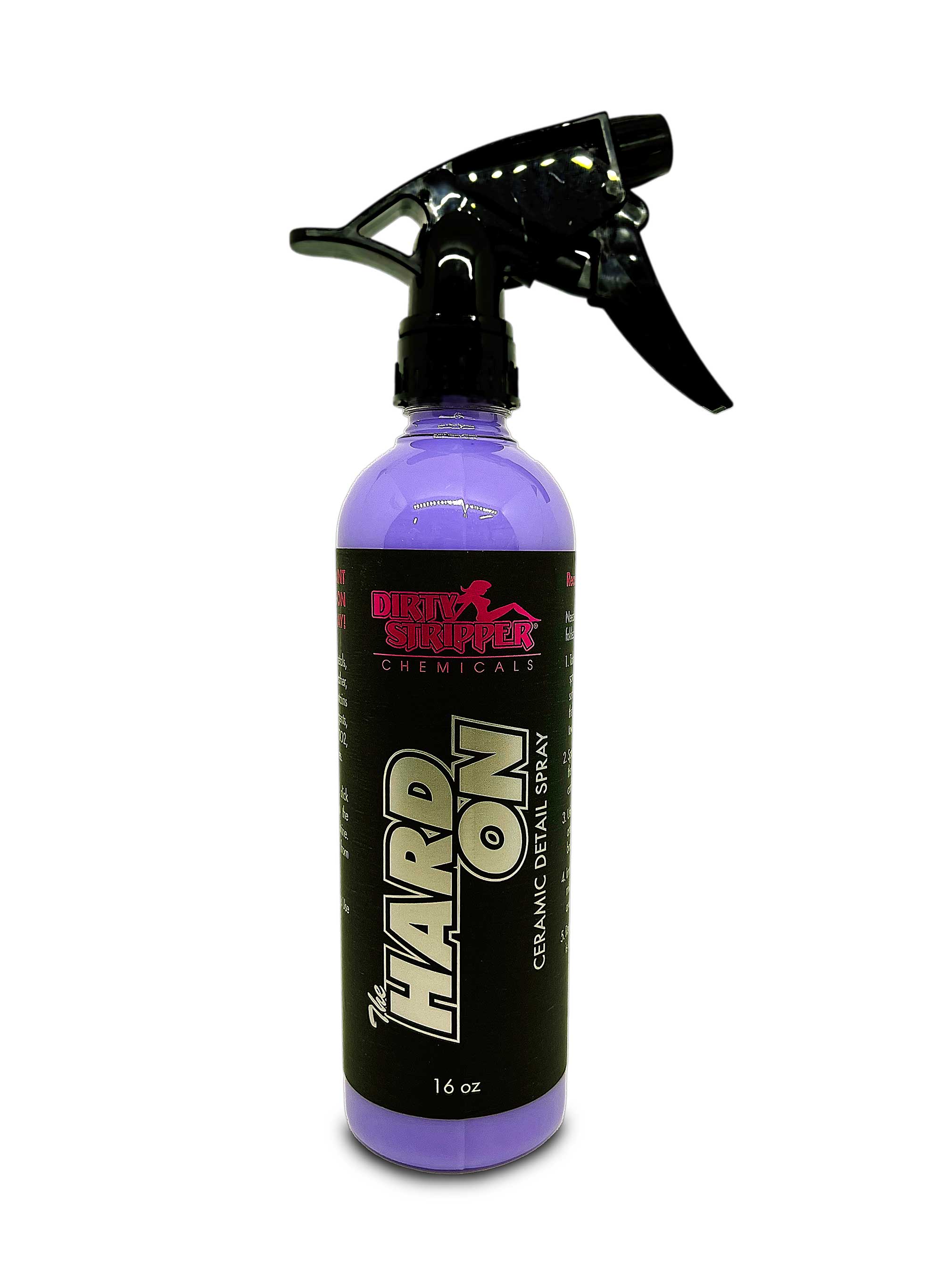 The Hard-On Ceramic Detail Spray Use on paint, rims, tires, metals, plastic, rubber, glass, leather, dashboard, and more. Contains multiple anti-static detergents, crosslinking polymers, SIO2, transparent gels, and hard waxes. As it cleans, it deposits a hard, slick surface sealant that protects the surface and creates a deep shine. Anti-statics keep dust and dirt from re-adhering so quickly.